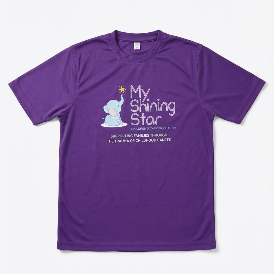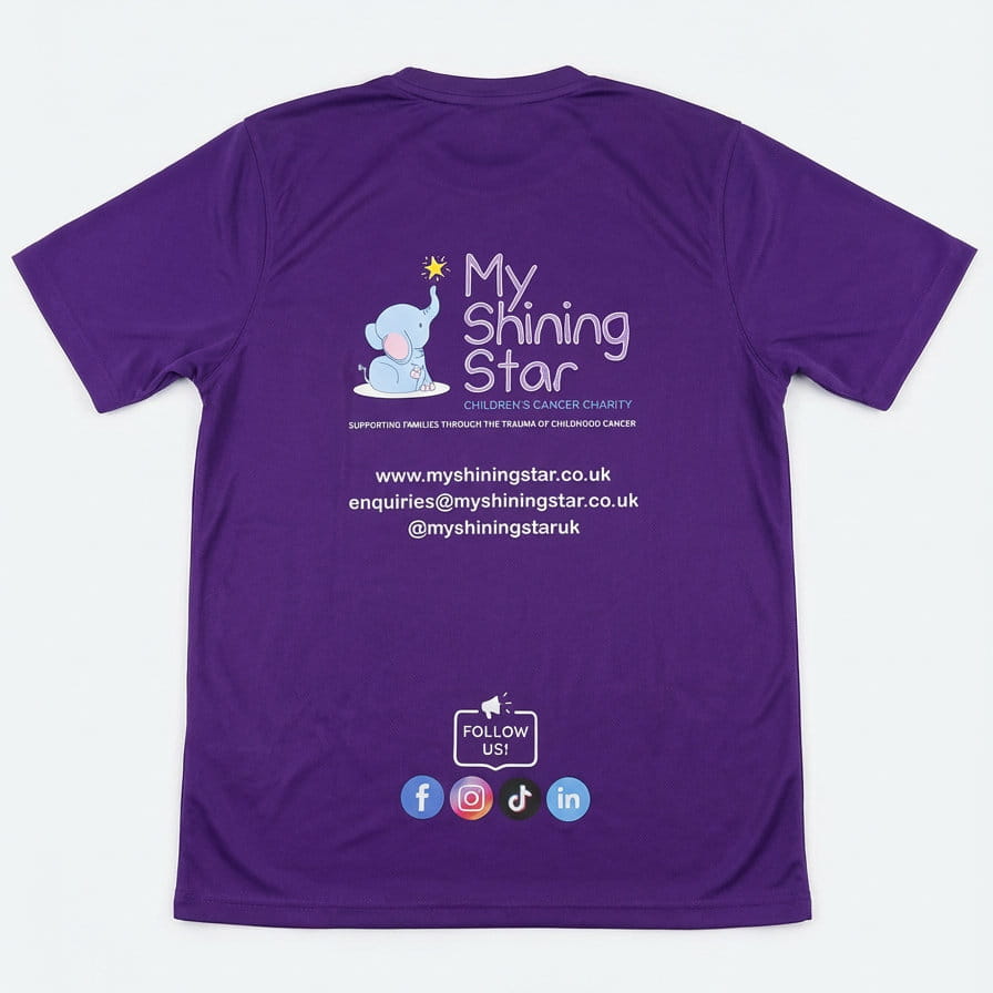 This purple t-shirt features the My Shining Star logo, with full charity branding, website details, and social media links printed on the back. It is ideal for fundraising events, awareness days, sponsored activities, or everyday wear.